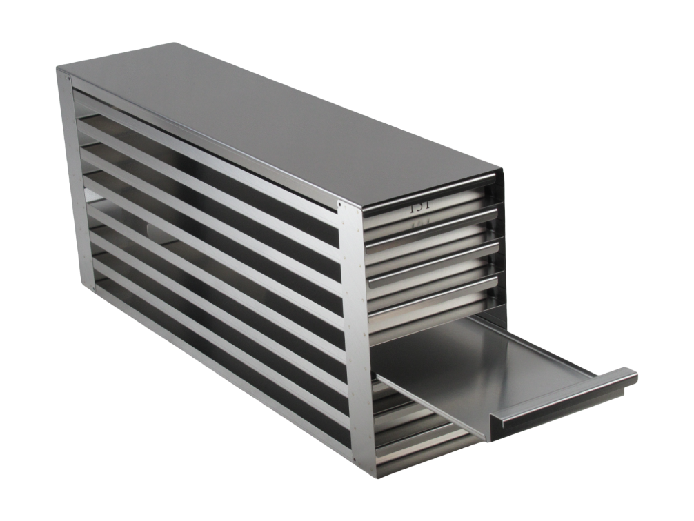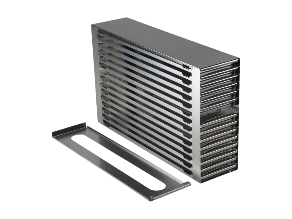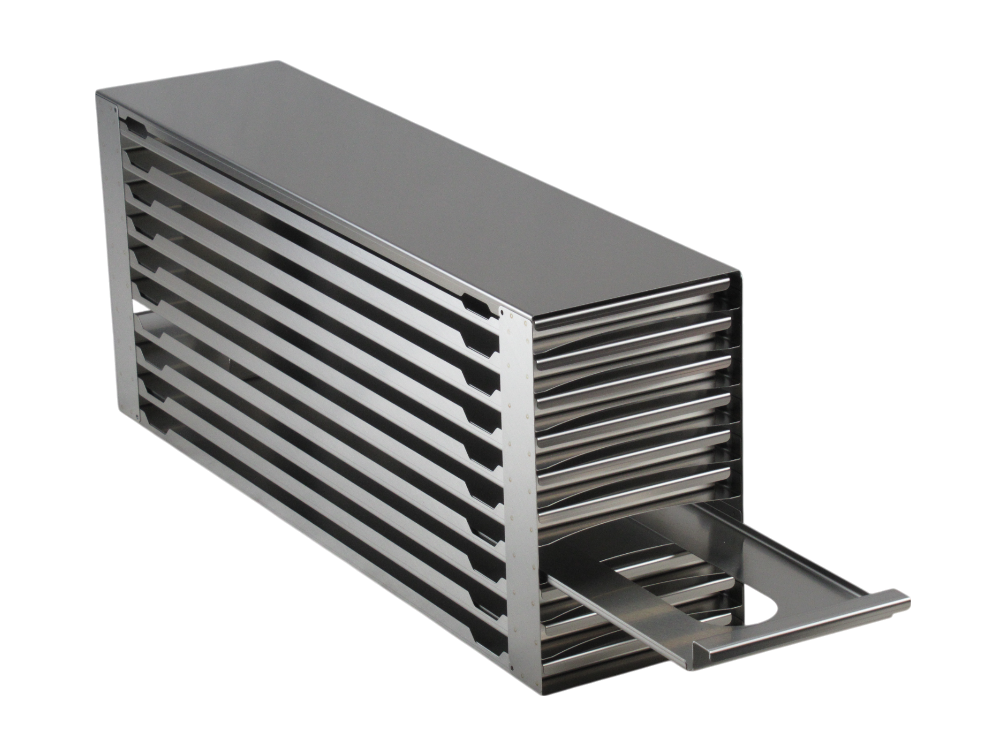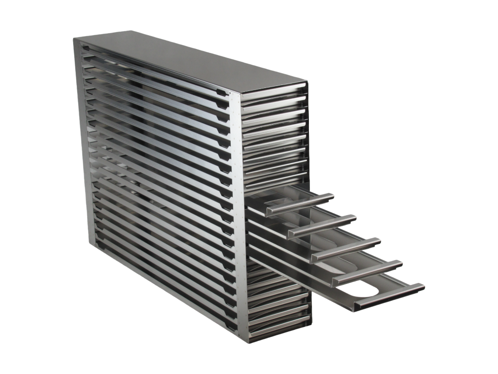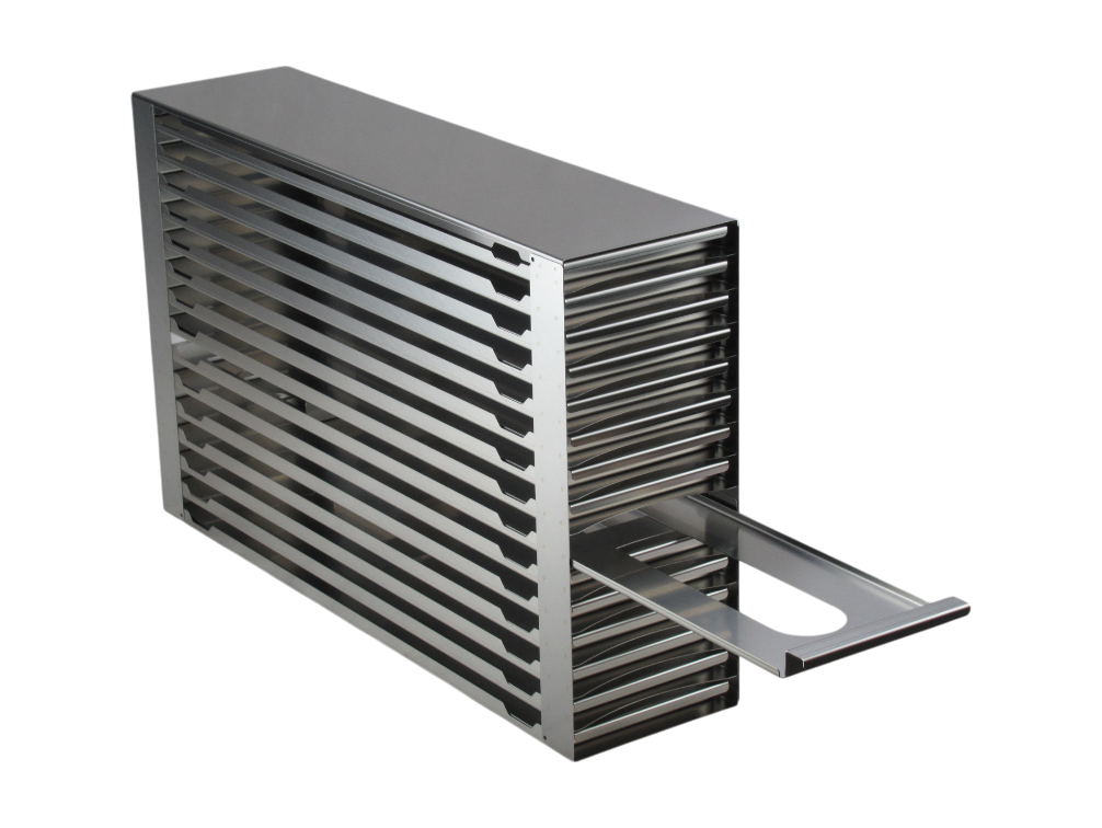 Einzeln herausziehbare Einschübe ermöglichen den einfachen Zugriff auf spezifische Platten, ohne dass das gesamte System entfernt werden muss. Dies reduziert den Zeitaufwand und minimiert das Risiko, Proben zu beschädigen oder zu verwechseln. Zudem sorgt die glatte Oberfläche des Edelstahls für eine leichte Reinigung und verhindert die Anhaftung von Verunreinigungen.